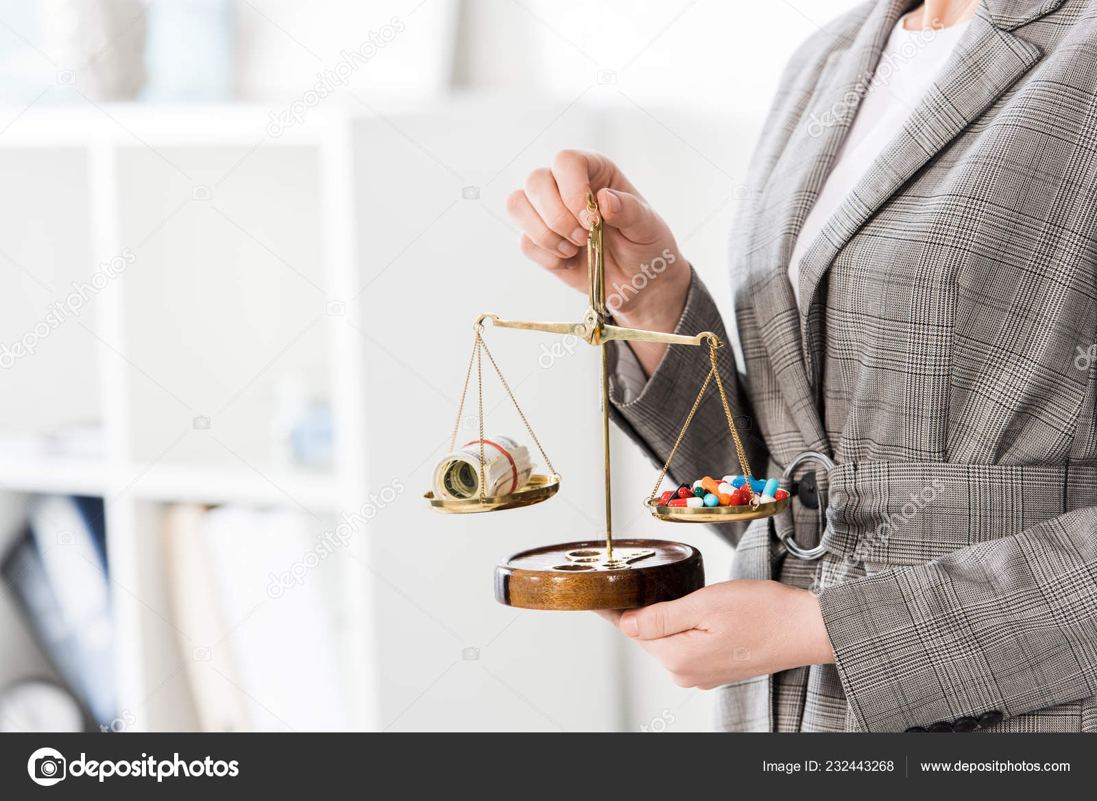 Stockfotografie geschnittenes Bild eines Anwalts, der im Büro die Waage mit Geld und Drogen auf dem Tisch hält: lizenzfreie Fotos