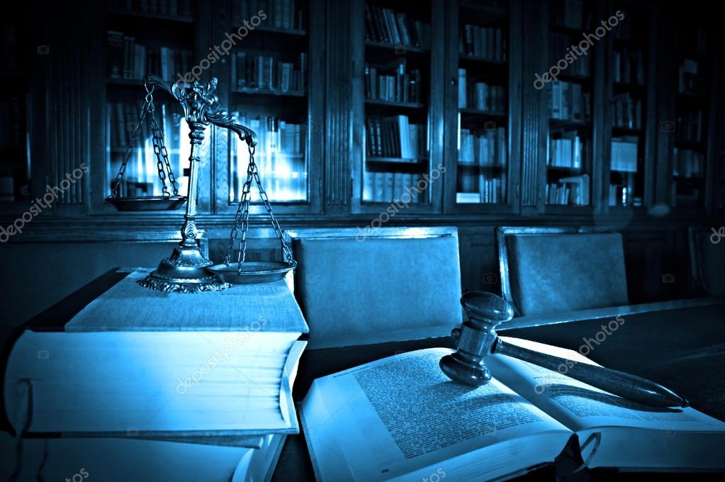 Symbol für Recht und Gerechtigkeit in der Bibliothek, Rechts- und Gerechtigkeitskonzept, blauer Ton