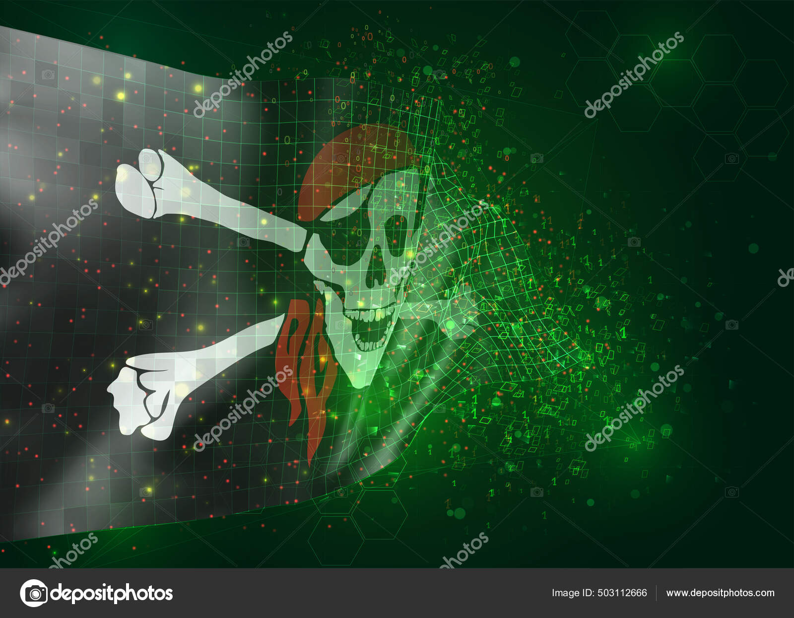 Vektorstock 3D-Vektornetzfahne eines Piratenschädels auf schwarzem Hintergrund mit Polygonen und Datennummern: Vektorgrafiken, lizenzfreie Grafiken